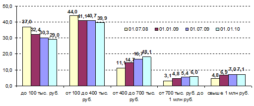 В IV квартале 2008 г. на волне популярности валютных вкладов резко выросли как краткосрочные, так и долгосрочные валютные вложения. В I квартале 2009 г. их динамика несколько замедлилась, но все же осталась на очень высоком уровне - около 30%, а во II квартале 2009 г. краткосрочные и долгосрочные валютные вклады снизились на 10,2 и 4%, соответственно. В III квартале небольшой рост (3,9 и 2,2%), а в IV квартале вновь снижение (1,6 и -2,3%). При этом на протяжении II, III и IV кварталов темпы прироста долгосрочных вкладов были выше краткосрочных. 6) После начала действия ССВ наблюдалась тенденция к укрупнению структуры вкладов населения. Так, в 2005-2007 гг. вклады размером свыше 100 тыс. руб. росли быстрее, нежели менее крупные вклады. При этом динамика роста вкладов свыше 100 тыс. руб. заметно ускорилась после двух повышений размера страхового возмещения - до 190 и до 400 тыс. руб. в 2006-2007 гг. На 1 января 2010 г. вклады до 100 тыс. руб. составили 1 556,1 млрд руб. или 20,8% суммы застрахованных вкладов. Сумма вкладов в интервале от 100 до 400 тыс. руб. - 2 140,2 млрд руб. (28,7%). Сумма депозитов от 400 до 700 тыс. руб. - 968,7 млрд руб. (13%). Сумма вкладов свыше 700 тыс. руб. - 2 799,4 млрд руб. (37,5%). Рис.9. Структура депозитов в зависимости от размера вкладов (в%)
