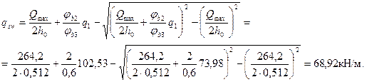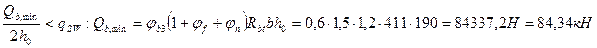 = . Так как Проверяем условие (57) [3]: Qb , min =φb 3 Rbt bh0 =0,6·1,7·250·512 = 89,9·103 кН; так как qsw =50,кН/м< Qb , min /(2h0 ) = 116,28/(2·0,512) = 87,75кН/м, то корректируем значение qsw по формуле: