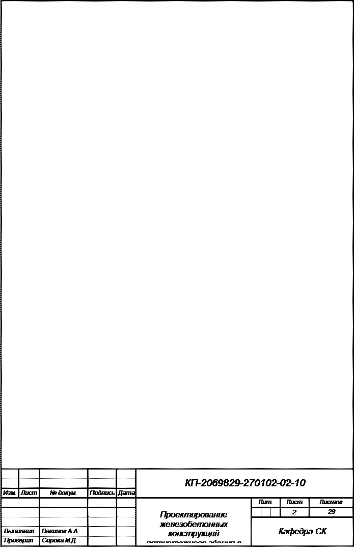 СПИСОК ИСПОЛЬЗОВАННЫХ ИСТОЧНИКОВ 1. Байков В.Н., Сигалов Э.Е. Железобетонные конструкции. Общий курс.-М.: Стройиздат, 1985. 2. СНиП 2.03.01-84. Бетонные и железобетонные конструкции. 3. Пособие по проектированию бетонных и железобетонных конструкций из тяжёлых и лёгких бетонов ( к СНиП 2.03.01-84). ЧастьII.-М.: ЦИТП, 1986. 4. Пособие по проектированию предварительно напряжённых железобетонных конструкций из тяжёлых и лёгких бетонов (к СНиП 2.03.01-84). ЧастьI.-М.: ЦИТП, 1986. 5. Пособие по проектированию предварительно напряжённых железобетонных конструкций из тяжёлых и лёгких бетонов (к СНиП 2.03.01-84). ЧастьII.-М.: ЦИТП, 1986. 6. СНиП II-27-81. Каменные и армокаменные конструкции. 7. СНиП 2.01.07-85. Нагрузки и воздействия. 8. СНиП 2.01.07-85. Нагрузки и воздействия. Дополнение. Раздел 10. Прогибы и перемещения Госстрой СССР.-М.: ЦИТП, 1989. 9. СНиП 2.02.01-83. Основания зданий и сооружений. 10. Бородачёв Н.А. Программная система для автоматизированного обучения по дисциплине «Железобетонные и каменные конструкции» АОС-ЖБК. В 4-х томах/СамАСИ, 1990. 11. Проектирование железобетонных конструкций: Справ. пос./А.Б. Голышев, Б.Я. Бачинский и др.; Под ред. А.Б.Голышева.-К.: Будивельник,1990.
