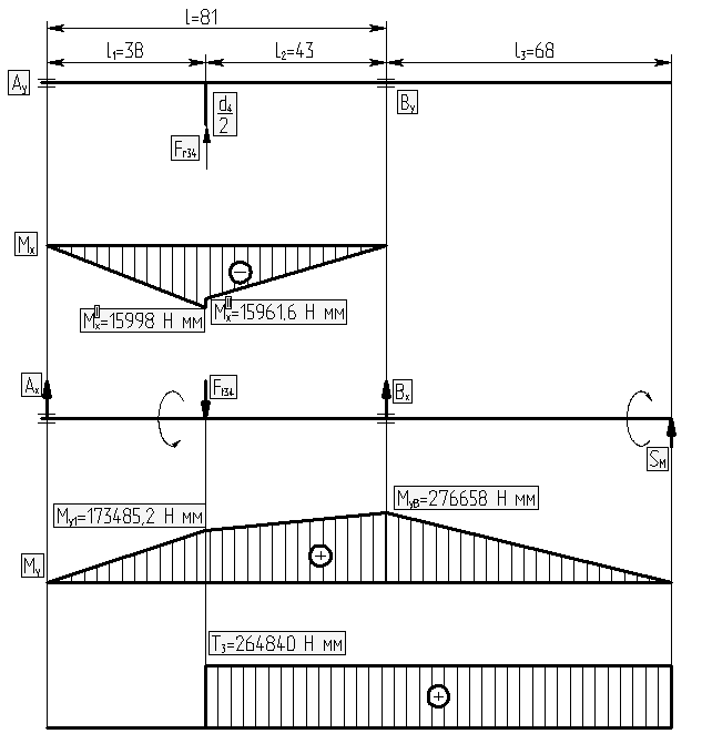 Проверка: Аy + Вy - Fr =2739,5+2740,5 - 5480=0 Изгибающие моменты в вертикальной плоскости