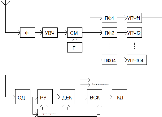 Требуется выделить сигналы от каждой станции,следовательно необходим блок полосовых фильтров: Упрощенная структурная схема приемника ЗС: