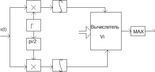 Схема содержит m=8 корреляторов и решающее устройство сравнения и выбора максимального из выходов корреляторов. Вопросы реального формирования опорных колебаний описаны в (7)Число опорных колебанийи соответственно корреляторов в демодуляторе сигналов с ФМ меньше, чем число вариантов фазы. Число опор многопозиционных ФМ сигналов может быть сведено к двум, если применить соответствующий вычислитель. Пусть имеются свертки принятого сигнала x(t) и квадратурных опорных колебаний с произвольной начальной фазой jо, т.е. ó Xo=ôx(t)*sin(wt+jo) õ (2) ó Xo=ôx(t)*cos(wt+jо) õ Тогда любой из интервалов: входящих в алгоритм (1), можно представить через (2) по формуле: Vi=Xo*cos(jj-jo) +Yo*sin(jj-jo) (3), следовательно общая схема когерентного демодулятора сигналов с многопозиционной ФМн может быть представлена в следующем виде: