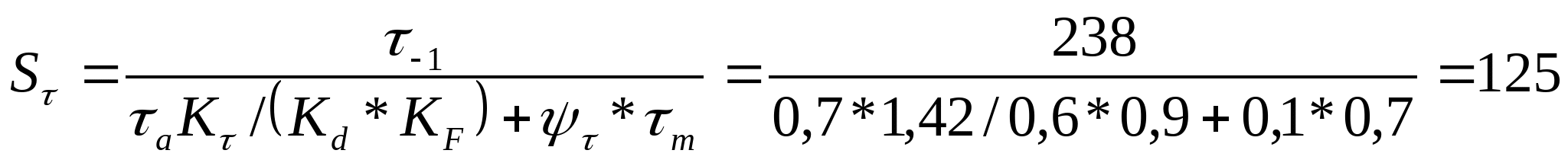 Коэффициент запаса в сечении по середине червяка при изгибе (симметричный цикл нагрузки) равен: где =410МПа – предел выносливости материала, =0,6 – масштабный фактор, =0,9 – коэффициент шероховатости поверхности, = 14,86МПа – амплитуда изменения напряжения. Коэффициент запаса прочности при кручении (пульсирующий цикл).  где МПа, МПа, - эффективный коэффициент концентрации, =0,1 – для легированных сталей