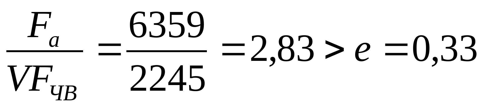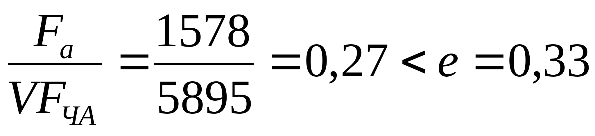 Ранее выбранные подшипники проверяем на динамическую грузоподъёмность и долговечность отдельно для быстроходного и тихоходного вала. 5.1. Проверка подшипников быстроходного вала. Осевая нагрузка на подшипники =6359Н Радиальная нагрузка на подшипники равна: Н Н Наиболее загружен подшипник в точке В. Для него и производим расчёт. Соотношение осевой и радиальной нагрузок на подшипник в сечении В: