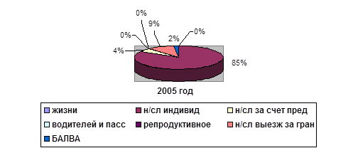Рис. 2.5. Структура количества заключенных договоров по добровольным видам личного страхования в 2003–2005 гг. Структура количества заключенных договоров по видам страхования распределяется также как и по страховым взносам. Наибольшую долю занимает добровольное индивидуальное страхование граждан от несчастных случаев. Значительным удельным весом обладают такие виды добровольного страхования как добровольное страхование от несчастных случаев за счет средств предприятий и добровольное страхование от несчастных случаев и болезней на время поездки за границу. Графически динамика количества заключенных договоров по добровольным видам страхования выглядит следующим образом.