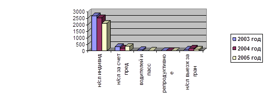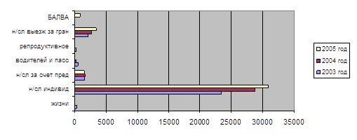 Рис. 2.4. Динамика поступления сумм страховых взносов в разрезе добровольных видов личного страхования за 2003–2005 гг. тыс. руб. Из рисунка видно, что добровольное индивидуальное страхование от несчастных случаев, которое занимало лидирующее место в структуре поступлений, имеет устойчивую тенденцию к росту. Рост популярности данного вида страхования у населения обусловлен большой разъяснительной работой специалистов и страховых агентов. Добровольное страхование от несчастных случаев выезжающих за границу также показывает положительную динамику. Учитывая долю поступлений сумм страховых взносов, занимаемую этими видами страхования, и темпы их роста можно сказать, что они являются наиболее прибыльными и перспективными для представительства. Наибольшая сумма страховых взносов по добровольному страхованию от несчастных случаев за счет средств предприятий поступила в 2004 г., что явилось следствием возросшего фонда заработной платы в данный период. Поступления по остальным видам добровольного личного страхования имеют скорее случайный характер. Проследим изменение структуры и динамики количества заключенных договоров по видам страхования. Для наглядности представим информацию о количестве заключенных договоров по добровольным видам личного страхования графически