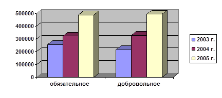 Рис. 2.2. Структура поступления сумм страховых взносов по добровольным видам личного страхования за 2003–2005 гг. Как можно заметить, добровольному индивидуальному страхованию от нечастных случаев на протяжении всего рассматриваемого периода принадлежит наибольший удельный вес в структуре поступления сумм страховых взносов. В абсолютном выражении поступление сумм страховых взносов составило в 2003 г. – 23,4 млн. руб.; 2004 г. – 28,8 млн. руб.; 2005 г. – 30,8 млн. руб. Данный вид страхования наиболее популярен у жителей региона, так как затрагивает наиболее важные аспекты их жизнедеятельности – жизнь и здоровье. Приведённые цифры свидетельствуют об устойчивом спросе со стороны страхователей. Значительным удельным весом обладает также добровольное страхование от несчастных случаев выезжающих за границу и добровольное страхование от несчастных случаев за счет средств предприятий. Благодаря активной маркетинговой деятельности со стороны работников представительства поступления по данным видам страхования постоянно увеличиваются. Доля оставшихся видов личного страхования страхование женщин, добровольное страхование расходов граждан, выезжающих за границу) невысока, поэтому существенного влияния на изменение структуры поступления сумм страховых взносов по личному страхованию она не оказала. Проследим динамику поступления сумм страховых взносов в разрезе обязательной и добровольной форм личного страхования и выявим тенденции их развития.
