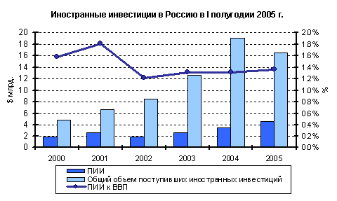 (Источники: Данные Министерства экономики РФ; Обзор экономики России. Основные тенденции развития. 2000, IV квартал. Рабочий центр экономических реформ при Правительстве РФ. Российско-европейский центр экономической политики. М. 2001. С. 103.) К середине 2001 г. общий объем иностранных инвестиций в стране составлял около 34 млрд дол., в том числе ПИИ – 17.6 млрд. Иностранные инвестиции составляют около 3 –4% общего объема всех инвестиций в стране. Министерство экономического развития и торговли России разрабатывает меры стимулирования, направленные на то, чтобы довести этот уровень до 10% валовых инвестиций в стране. К 2004 г. в соответствии с программой социально-экономического развития Российской Федерации на перспективу (2002-2004 гг.) прямые иностранные инвестиции должны составлять не менее 6 млрд дол. в год (что мы в последствии и достигли). Объем иностранных инвестиций, поступивших в российскую экономику в январе-сентябре 2005 года, составил 26,83 млрд долларов, что на 7,9% ниже соответствующего периода 2004 года. Эти данные распространила федеральная служба государственной статистики. Негативная динамика - результат значительного роста в 2004 году, уверяют статистики. В январе-сентябре 2004 года был существенный рост иностранных инвестиций в РФ - на 39,4% по сравнению с 9 месяцами 2003 года, напоминает Росстат. [13]. В целом накопленный объем иностранных инвестиций в российской экономике по итогам трех первых кварталов 2005 года составил в России $91 миллиард, сообщил глава МЭРТ РФ Герман Греф, выступая на международном форуме в Москве "Инвестиции в России: проблемы и решения". По сравнению с показателем прошлого года это рост на 37%, добавил министр, передает РИА "Новости". Всего за I полугодие 2005 г. в экономику России поступило $16,5 млрд. иностранных инвестиций, что на 13% меньше АППГ (рис. 3.1) Рис. 3.1