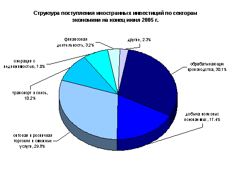На графике: ПИИ – прямые иностранные инвестиции Объем прямых инвестиций в I полугодии 2005 г. увеличился на 31% и составил $4,49 млрд., при этом и по отношению к ВВП наблюдается незначительный рост до 1,36% (1,3% в I полугодии 2004 г.).В общем объеме поступлений наблюдается более существенное увеличение доли прямых инвестиций до 27,2% (18,0% в I полугодии 2004 г.). Объем прочих иностранных инвестиций по итогам I полугодия 2005 г. составил $11,84 млрд., что на 13,3% меньше АППГ. В результате, их доля в общем объеме сократилась до 71,7% (81,3% в I полугодии 2004 г.). Объем портфельных инвестиций вырос на 32,2%, как и прежде оставаясь на относительно невысоком уровне ($175 млн., 1,1% от общего объема инвестиций). По рисунку 3.2 мы можем судить о том, что в отраслевой структуре поступлений иностранных инвестиций 49% ($8 млрд.) приходится на промышленность (54% в I полугодии 2004 г.), где 62% приходится на обрабатывающие производства ($4,97 млрд.), а 36% ($2,87 млрд.) на отрасли добычи полезных ископаемых и всего 2% ($170 млн.) на производство и распределение электроэнергии, газа и воды. В том числе в обрабатывающей промышленности почти 25% приходится на металлургию, а 77% инвестиций в добычу полезных ископаемых направляется в топливно-энергетический комплекс. Можно отметить, что по сравнению с АППГ в структуре инвестиций в промышленность несколько сократилась доля инвестиций в добычу полезных ископаемых (до 49%), в целом доля инвестиций в добычу полезных ископаемых в общем объеме инвестиций составила 17,4%. Рис. 3.2