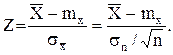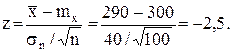 Мы видим, что наблюдаемое значение z = - 2,5 нe принадлежит интервалу [-2,33;¥), поэтому гипотезу нужно отвергнуть. Приведем пример гипотезы с двухсторонней оценкой. Пусть фирма, выпускающая стабилитроны определенного типа, утверждает, что номинальное напряжение стабилизации стабилитронов равно 10 В. Естественно, что отклонение напряжения стабилизации в меньшую или большую стороны одинаково нежелательно. Выдвинем гипотезу, что генеральное среднее напряжение стабилизации равно 10 В, а затем проверим эту статистическую гипотезу по результатам наблюдения. Пусть при испытании 100 стабилитронов среднее выборочное равно 10,3 В, а несмещенное выборочное среднее квадратичное отклонение равно 1,2 В. Можно ли с доверительной вероятностью 0,95 считать выдвинутую гипотезу справедливой? Так как объем выборки больше 30, то можно, как и в предыдущем примере, ввести гауссовскую случайную величину Z. Найдем