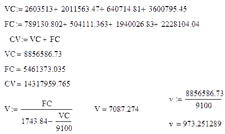Расчёт полной себестоимости. После данных расчётов и с использованием полученных данных составляют смету затрат на производство по статьям расходов и используя данные поэлементного содержания РСЭО и ЦР. Критический объём производства для первого изделия. Так как предприятие ставит своею целью получение прибыли то необходимо сделать анализ возможности её получения на основе нахождения критического объёма производства при сформированной цене. На основании подсчитанной себестоимости и желаемой прибыли необходимо подсчитать цену единицы товара с учётом налогов. Ц = ( с/с + П ) + НДС, где Ц – цена, руб. с/с – полная себестоимость продукции, руб. П – планируемый размер прибыли на единицу продукции, руб.(20 % от полной себестоимости) НДС – налог на добавленную стоимость на единицу продукции определяется по ставке 20 % к цене предприятия на единицу продукции ( с/с + п ), руб. Ц = (1211 + 242,2) + 290,64 = 1453,2+290,64 = 1743,84 р. Теперь с расчётом на эту цену и запланируемый объём производства найдём запас финансовой прочности. Подсчитаем переменные и постоянные затраты. Переменные (VC): затраты сырья и материалов + затраты на з/п основных рабочих. Постоянные (FC): арендная плата + амортизация оборудования + управленческие расходы.