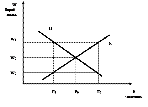 Рис. 1 – Классическая модель 2. Неоклассической модели. В современной неоклассической модели рынка труда расходы домохозяйств на образование рассматриваются как инвестиции в человеческий капитал по аналогии с инвестициями фирм в машины и оборудование. Заработная плата выступает как прибыль на эти вложения. Согласно неоклассической модели цена труда гибко реагирует на потребности рынка, увеличиваясь или уменьшаясь в зависимости от спроса и предложения. Домохозяйства инвестируют в квалификацию до тех пор, пока норма прибыли на эти вложения не начинают понижаться. Если на рынке труда достигнуто ценовое равновесие, то безработица невозможна. Совокупный спрос на труд складывается из спроса на труд отдельных фирм. Он представляет собой суммарный спрос на труд со стороны фирм. (Рис. 2).