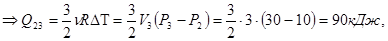 =mg: отсюда найдём силу реакции опоры: N=mg+ma. Так как центростремительное ускорение определяется по формуле: Подставим данные и произведём вычисления: N=60 (10+100/5) =1800H По третьему закону Ньютона сила давления человека на сиденье по модулю равна силе реакции опоры, т.е. Fд =N, Fд =1800H Ответ: 1800Н. Задача С3. На диаграмме представлены изменения давления и объёма идеального одноатомного газа. Какое количество теплоты было получено или отдано газом при переходе из состояния 1 в состояние 3? Решение. Общее количество теплоты определим по формуле: Q123 =Q12 +Q23 Q12 =A12 +ΔU12’ где А12 =РΔV=0 ΔU=3/2νRΔT=3/2V1 (P2 -P1 ) тогда количество теплоты на участке 1-2 будет равно: Q12 =3/2∙1∙(10-30)= -30кДж. Количество теплоты на участке 2-3 будет равно: Q23 =A23 +ΔU23 ; Q23 = P2 (V3 -V2 ) + 3/2P2 (V3 -V2 )= = 5/2P2 (V3 -V2 ); Q=5/2∙10∙(3-1)=50 кДж, тогда общее количество теплоты будет равно: Q=-30+50=20кДж