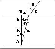 Задача С5. У самой поверхности в реке летит комар, Стая рыб находится на расстоянии 2 м от поверхности воды. Каково максимальное расстояние до комара, на котором он ещё виден рыбам на этой глубине? Относительный показатель преломления света на границе воздух - вода равен 1,33. Решение. Изобразим расположение стаи рыб и комара на поверхности воды: В точке А находятся рыбы, в точке В - комар. По закону преломления имеем формулу: ![]()