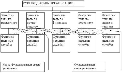 Вывод: достоинства дивизионных структур перевешивают их недостатки только в периоды достаточно стабильного существования, при нестабильном окружении они рискуют повторить судьбу динозавров. При данной структуре возможно воплотить большую часть идей современной философии качества. Органический тип структур управленияОрганические или адаптивные структуры управления стали развиваться примерно с конца 70-х годов, когда, с одной стороны, создание международного рынка товаров и услуг резко обострило конкуренцию среди предприятий и жизнь потребовала от предприятий высокой эффективности и качества работы и быстрой реакции на изменения рынка, и с другой стороны, стала очевидной неспособность структур иерархического типа этим условиям соответствовать[14]. Главным свойством управленческих структур органического типа является их способность изменять свою форму, приспосабливаясь к изменяющимся условиям. Разновидностями структур этого типа являются проектные, матричные (программно-целевые), бригадные формы структур . При внедрении этих структур необходимо одновременно изменять и взаимоотношения между подразделениями предприятия. Если же сохранять систему планирования, контроля, распределения ресурсов, стиль руководства, методы мотивации персонала, не поддерживать стремление работников к саморазвитию, результаты внедрения таких структур могут быть отрицательными. Бригадная (кросс - функциональная) структура управленияОсновой этой структуры управления является организация работ по рабочим группам (бригадам). Форма бригадной организации работ - достаточно древняя организационная форма, достаточно вспомнить рабочие артели, но только с 80-х годов началось ее активное применение как структуры управления организацией, во многом прямо противоположной иерархическому типу структур. Основными принципами такой организации управления являются: -автономная работа рабочих групп (бригад); -самостоятельное принятие решений рабочими группами и координация деятельности по горизонтали; -замена жестких управленческих связей бюрократического типа гибкими связями; -привлечение для разработки и решения задач сотрудников разных подразделений. Эти принципы разрушает свойственное иерархическим структурам жесткое распределение сотрудников по производственным, инженерно-техническим, экономическим и управленческим службам, которые образуют изолированные системы со своими целевыми установками и интересами[9]. В организации, построенной по этим принципам, могут как сохраняться функциональные подразделения ( Рис.4 ), так отсутствовать (Рис.4 ). В первом случае работники находятся под двойным подчинением - административным (руководителю функционального подразделения, в котором они работают) и функциональным (руководителю рабочей группы или бригады, в которую они входят). Такая форма организации называется кросс-функциональной , во многом она близка к матричной . Во втором случае функциональные подразделения как таковые отсутствуют, ее мы будем назвать собственно бригадной . Такая форма достаточно широко применяется в организации управления по проектам . Преимущества бригадной (кросс-функциональной) структуры: