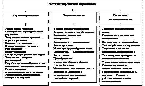 Рис. 1. Система методов управления персоналом в организации Административные методы базируются на власти, дисциплине и взысканиях и известны в истории как «методы кнута». Экономические методы основываются на правильном использовании экономических законов и по способам воздействия известны как «методы пряника». Социально-психологические методы исходят из мотивации и морального воздействия на людей и известны как «методы убеждения». Административные методы ориентированы на такие мотивы поведения, как осознанная необходимость дисциплины труда, чувство долга, стремление человека трудиться в определенной организации, на культуру трудовой деятельности[3] . Экономические методы - это элементы экономического механизма, с помощью которого обеспечивается прогрессивное развитие организации. Важнейшим экономическим методом управления персоналом является технико-экономическое планирование, которое объединяет и синтезирует в себе все экономические методы управления. С помощью планирования определяется программа деятельности организации. После утверждения планы поступают линейным руководителям для руководства работой по их выполнению. Каждое подразделение получает перспективные и текущие планы по определенному кругу показателей. Социально-психологические методы управления основаны на использовании социального механизма управления (система взаимоотношений в коллективе, социальные потребности и т.п.). Специфика этих методов заключается в значительной доле использования неформальных факторов, интересов личности, группы, коллектива в процессе управления персоналом. Социально-психологические методы базируются на использовании закономерностей социологии и психологии. Объектом их воздействия являются группы людей и отдельные личности. По масштабу и способам воздействия эти методы можно разделить на две основные группы: 1. Социологические методы, которые направлены на группы людей и их взаимодействие в процессе трудовой деятельности. 2. Психологические методы, которые направленно воздействуют на личность конкретного человека. Социологические методы играют важную роль в управлении персоналом, они позволяют установить назначение и место сотрудников в коллективе, выявить лидеров и обеспечить их поддержку, связать мотивацию людей с конечными результатами производства, обеспечить эффективные коммуникации и разрешение конфликтов в коллективе. Постановку социальных целей и критериев, разработку социальных нормативов (уровень жизни, оплата труда, потребность в жилье, условия труда и др.) и плановых показателей, достижение конечных социальных результатов обеспечивает социальное планирование.[4] Необходимые данные для подбора, оценки, расстановки, обучения персонала и обоснования принятия кадровых решений позволяют получить следующие социологические методы исследования (научные инструментарии): 1. Анкетирование позволяет собирать необходимую информацию путем массового опроса людей с помощью специальных анкет. 2. Интервьюирование предполагает подготовку до беседы сценария (программы), затем — в ходе диалога с собеседником — получение необходимой информации. Интервью - идеальный вариант беседы с руководителем, политическим или государственным деятелем — требует высокой квалификации интервьюера и знач