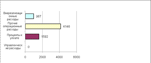 Рис. 2.2. Структура расходовза 2008 год На рис. 2.1. и 2.2. видно за 2008 год почти в два раза увеличились все статьи расходов. Более половины всех расходов организации составляют прочие операционные расходы, так же большую часть составляют проценты к уплате. Рентабельность предприятия уменьшилась в 2008 году, что свидетельствует о снижении эффективности работы ЗАО «Строительный альянс» Таким образом, в целом несмотря на увеличение расходов, предприятие получило прибыль по результатам финансово-хозяйственной деятельности в 2008 году в целом благодаря снижению себестоимости произведенных работ, услуг. 2.2 Анализ функционирования системы управления персоналом в ЗАО «Строительный Альянс» Высшим органом управления общества является общее собрание его участников. Управление в ЗАО «Строительный Альянс» осуществляется единолично - директором. Директор ЗАО «Строительный Альянс» реализует свои обязанности на принципе единоначалия, несет персональную ответственность за деятельность предприятия. Организационная структура ЗАО «Строительный Альянс» - линейная. Основу линейной организационной структуры предприятия составляет так называемый «шахтный» принцип построения и специализация управленческого процесса по функциональным подсистемам организации. По каждой подсистеме формируется иерархия служб («шахта»), пронизывающая всю организацию сверху донизу. Структура управления предприятием представлена на рисунке 2.3.