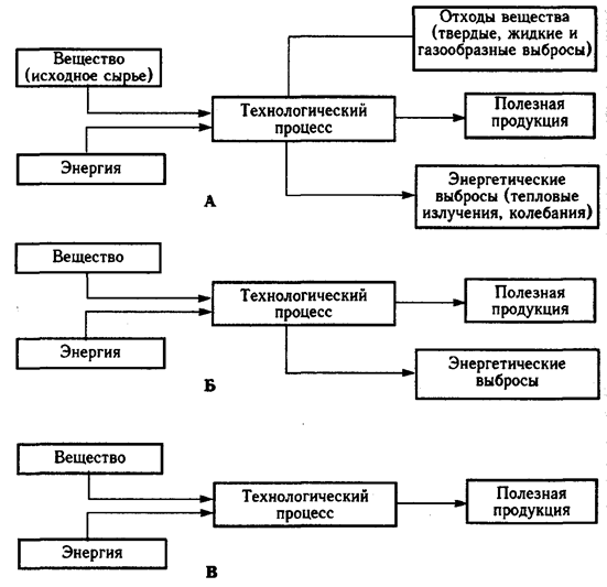 Рис. 2. Материальные потоки в производственных процессах различной степени замкнутости 10.2. Проблемы отходности производстваЭкологизация и снижение природоемкости производства предполагают сокращение валового внесения в природную среду техногенных эмиссии. Сделать производство полностью безотходным невозможно. Задача вовсе не сводится к тому, чтобы устранить абсолютно все экологически отрицательные последствия производственных процессов. Ставить такую задачу равносильно намерению изобрести вечный двигатель второго рода - безэнтропийный. Условно безотходными могут быть только отдельные стадии технологического цикла производства. Тем не менее, существуют теории безотходных процессов (Зайцев, 1987; Кухарь, 1989) и отдельные положения, касающиеся этой проблемы. Так, согласно определению, принятому на семинаре Европейской экономической комиссии ООН по малоотходной технологии (Ташкент, 1984), «безотходная технология - это такой способ производства продукции (процесс, предприятие, территориально-производственный комплекс), при котором наиболее рационально и комплексно используются сырье и энергия в цикле «сырьевые ресурсы - производство - потребление - вторичные сырьевые ресурсы* таким образом, что любые воздействия на окружающую среду не нарушают ее нормального функционирования». Иногда, особенно в зарубежной литературе, употребляется термин «чистое производство», под которым понимают технологическую стратегию, предотвращающую загрязнение окружающей среды и понижающую до минимума риск для людей и окружающей среды. Применительно к процессам - это рациональное использование сырья и энергии, исключение применения токсичных сырьевых материалов, уменьшение количества и степени токсичности всех выбросов и отходов, образующихся в процессе производства. С точки зрения продукции чистое производство означает уменьшение ее воздействия на окружающую среду в течение всего жизненного цикла продукта от добычи сырья до утилизации (или обезвреживания) после использования. Чистое производство достигается путем улучшения технологии, применением ноу-хау и/или улучшением организации производства (Зайцев, 1987). Отметим, что эти определения не подразумевают возможности полной безотходности производства. Создание малоотходных ресурсосберегающих технологий выдвигает ряд общих требований, направленных на качественное изменение производства. Это: - комплексная переработка сырья с использованием всех его компонентов; - интенсификация производственных процессов на основе их автоматизации, электронизации и роботизации; внедрение наукоемких, высокотехнологичных автоматизированных систем; - цикличность и замкнутость материальных потоков при минимизации производственных отходов; - уменьшение разделения технологического процесса на отдельные операции, сокращение числа промежуточных стадий перехода от сырья к конечному продукту; применение непрерывных процессов и сокращение времени технологических циклов; - сокращение удельного потребления природных ресурсов и энергии, максимальная замена первичных ресурсов вторичными, рециркуляция побочных продуктов и отходов в основной процесс, регенерация избыточной энергии; - применение комбинированных энерготехнологических процессов, обеспечивающих максимальное использовани