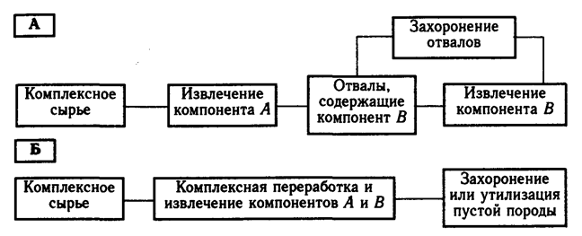 Рис. 3. Альтернативные варианты переработки комплексных руд: А - традиционная технология; Б - малоотходная технология Малоотходные технологии в перерабатывающей промышленности основываются на производственных циклах, в которых сокращено число технологических переходов от сырья к готовой продукции, повышена замкнутость материальных потоков и, соответственно, уменьшен коэффициент вредного действия. Первыми примерами таких комплексных технологических процессов, проектируемых под конкретные изделия или продукцию и работающих по схеме «мономер - изделие», «материал - конструкция», «сырье - продукция», когда число раздельных операций минимизируется, являются технологии роторных линий, порошковой металлургии, гибких автоматизированных линий «материал - агрегат», термофронтального синтеза материалов. В этих случаях получены и наиболее качественная продукция, и наиболее серьезные результаты в области создания энергосберегающих и малоотходных процессов. Технологии, основанные на сокращении числа технологических переходов и повышении их информационного содержания, так называемые наукоемкие технологии, могут быть отнесены к технологиям первого рода с точки зрения их экологического соответствия. Они предусматривают изменение организации производственных комплексов на уровне элементарных технологических структур и определяют стратегическое направление технологического перевооружения. Правда, они требуют и наибольших вложений и времени. Другое направление связано с разработкой технологий, при которых обеспечивается рециркуляция, или возвращение побочных продуктов, в основной процесс или сопутствующую технологию. Примеры таких решений - технологий второго рода - процессы регенерации и рекуперации минеральных масел, смазочно-охлаждающих жидкостей, регенерации и коррекции отработанных травильных растворов и электролитов гальванического производства. Важной особенностью этих технологий является то, что, осуществляя коррекцию растворов, возвращая в основной процесс необходимые компоненты и регенерируя из водных растворов медь (а это важно для экологической безопасности стоков), они функционируют так, что без них основной технологический процесс невозможен. Другой пример технологий второго рода - это утилизация избыточного активного ила городских очистных сооружений для целей строительства, сельского хозяйства и извлечения некоторых ценных химических продуктов. В частности, для его гомогенизации и переработки предложен способ, в результате применения которого может быть получено жидкое топливо с калорийностью на уровне спирта. К этому роду технологий относится также получение биогаза на основе переработки отходов животноводства и другой биогенной органики. К технологиям третьего рода могут быть отнесены операции и процессы, в которых депонированные отходы производства, обладающие потенциалом загрязнения, используются для вторичной переработки и получения новых продуктов с пониженной химической активностью. Примеры: изготовление керамзита, шлакоблоков и других строительных и облицовочных материалов с использованием отходов добывающей промышленности, металлургии и химии; переработка автопокрышек в стойкие сантехнические изделия и т.п. Наиболее насущные потребности связаны с внедрением т