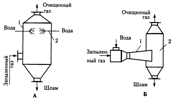 Рис. 7. Пылеуловители мокрой очистки: А - полный форсуночный газопромывагель: 1 - корпус, 2 - форсунки; Б - скруббер Вентури: 1 - труба-распылитель, 2 - циклоп-пылеуловитель Электрическая очистка - один из наиболее совершенных методов очистки газов от мелкодисперсной пыли. Установка электрической очистки состоит из собственно электрофильтра и питающего устройства, предназначенного для подачи тока высокого напряжения на электроды электрофильтра. Отрицательно заряженные аэрозольные частицы под действием электрического поля движутся к осадительному электроду, а относительно небольшая масса положительно заряженных частиц оседает на коронирующем электроде. Улавливание туманов. Для очистки газовых выбросов от туманов кислот, щелочей, масел и других жидкостей применяют волокнистые и сеточные фильтры-туманоуловители и мокрые электрофильтры. Их действие основано на захвате частиц жидкости волокнами при пропускании туманов через фильтрующий элемент с последующим отеканием жидкости. Для улавливания грубодисперсных примесей используют брызгоуловители, состоящие из пакетов металлических сеток. Часто применяют двухступенчатые установки, включающие фильтр для улавливания крупных капель и фильтр для очистки от тумана. Мокрые электрофильтры, применяемые для улавливания туманов, по принципу действия аналогичны сухим электрофильтрам. Для очистки газов от газо- и парообразных загрязнителей применяют четыре основных способа: промывку выбросов и поглощение примесей жидкостью (абсорбция), поглощение примесей твердыми активными веществами (адсорбция), поглощение примесей за счет каталитических превращений и термическая нейтрализация отходящих газов. Для улавливания паров летучих растворителей используют также метод конденсации, в основе которого лежит уменьшение давления насыщенного пара растворителя при понижении температуры. Очистка выбросов методом абсорбции состоит в разделении газообразной смеси на составные части путем поглощения некоторых газовых компонентов жидким поглотителем (абсорбентом). Для контакта газового потока с абсорбентом газ пропускают через абсорберы - насадочные башни, форсуночные, барботажнопенные скрубберы и другие аппараты. Отработанный раствор подвергают регенерации, десорбируя загрязняющее вещество, и возвращают его в процесс очистки либо выводят в качестве побочного продукта. Адсорбционные методы очистки газов основаны на способности некоторых твердых пористых тел - адсорбентов - селективно извлекать и концентрировать на своей поверхности отдельные компоненты газовой смеси. Различают физическую и химическую адсорбцию (хемосорбцию). При физической адсорбции поглощаемые молекулы газа удерживаются на поверхности твердого тела межмолекулярными силами притяжения. В основе хемосорбции лежит химическое взаимодействие между адсорбентом и адсорбируемым газом. В качестве адсорбентов применяют пористые материалы с развитой поверхностью: активные угли, силикогель, алюмогель, цеолиты. Процесс очистки проводят в адсорберах, которые выполняются в виде вертикальных, горизонтальных или кольцевых емкостей, заполненных адсорбентом. Наиболее распространены адсорберы периодического действия, в которых отработанный поглотитель по мере необходимости заменяют либо регенерируют. Адсорбиров