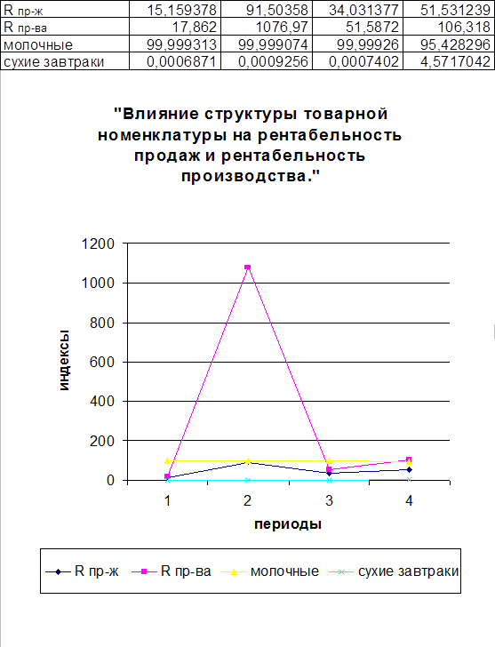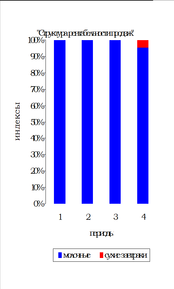 График 3 На основе графика №3 можно сделать некоторые выводы. Наибольшую долю в реализуемой продукции ЗАО «Кормчий» занимает товарная группа «Молочные продукты». Они приносят постоянный и наибольший доход, чем другая товарная группа. А также группа «Молочные продукты» влияет на рентабельность продаж и рентабельность производства. Спрос на товарную группу «Молочные продукты» продолжался на протяжении всех четырех месяцев. Значит, фирме ЗАО «Кормчий» выгоднее работать с этой группой, а не с товарной группой «Сухие завтраки». Это можно объяснить тем, что товарная группа «Сухие завтраки» реализовывались только в четвертом периоде и принесли фирме прибыль в сумме 14 тыс. 560 руб. (см. таблицу №1). График 4 2.4. «Исследование динамики цен на продукцию». Прежде всего, необходимо определить, что такое цена. Цена – это обменный эквивалент стоимости товара или услуги, выраженный в деньгах. Фирма ЗАО «Кормчий» находится на таком рынке, на котором находится множество конкурентов. Каждый продавец чутко реагирует на стратегию и действие конкурентов. Если, например кто-то из конкурентов ЗАО «Кормчий» понизит свои цены, то основная масса клиентов перейдет к нему. Тогда нашему предприятию тоже придется снизить цены, а это не совсем выгодно для фирмы. Для клиентов ЗАО «Кормчий» цена – это что-то, с помощью чего можно сравнить м/д собой конкурирующие товары. Т.е. клиенты рассматривают цену с точки зрения ее доступности, а также качества и количества приобретаемых товаров. ЗАО «Кормчий» на протяжении трех месяцев (1,2,3 исследуемые периоды) почти не изменяло цен на свою продукцию, т.е. цены не влияли на выручку, прибыль (см. таблицу №). Самый распространенный метод ценообразования – это включение в цену товара своих издержек. Но также следует учитывать и другой метод, основанный на текущих ценах. Т.о. ЗАО «Кормчий» использовало два метода: 1. Включение в цену товара своих издержек. 2. Метод, основанный на текущих ценах. Текущие цены ЗАО «Кормчий» на исследуемые периоды.