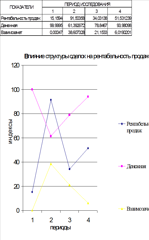2.5. «Исследование структуры сделок». Для каждого предприятия, фирмы очень большое значение имеет вид сделки. Сделка – это обмен ценностями м/д двумя сторонами. ЗАО «Кормчий» использует два вида сделок: 1. Денежная (может быть наличная и безналичная). 2. Взаимозачет. Для того чтобы выявить, какая из представленных форм сделок наиболее предпочтительна для фирмы нужно, рассчитать показатель, сделок: Сji Sij сделка = ------- Выр.i где Сij – это объем j-ого вида сделки в периоде Выр. i – это выручка i-ого периода Представим этот показатель в таблице №6 «Динамика показателей структуры сделок» и график №4 «Влияние структуры сделок на рентабельность продаж». Таб. 7 По графику видно, что при повышении сделок по взаимозачету и не большое уменьшение сделок по денежной форме во втором периоде фирма достигла наибольшего числа рентабельности продаж. Но как только снизились сделки по взаимозачету, а денежные наоборот возросли, рентабельность продаж в третьем периоде снизилась. Однако в четвертом периоде фирма продолжала все меньше использовать сделки по взаимозачету, а больше стала использовать денежные сделки. При этом рентабельность продаж стала расти. Судя по графику можно сказать, что наиболее предпочтительным для фирмы являются сделки по взаимозачету, но при этом не стоит закрывать денежные сделки. 2.6. «Исследование системы распределения продукции ЗАО «Кормчий». Для фирмы выбор канала распределения является очень серьезным вопросом, решение которого зависит от оценки розничной торговой компании. Каналы распределения, выбранные, фирмой, влияют на все последующие решения маркетинга фирмы. Канал распределения – это система предприятий, организаций, отдельных лиц, которые доставляют товары или услуги от производителя к потребителю. Протяженность канала распределения зависит от находящихся в нем промежуточных уровней. ЗАО «Кормчий» является одним из таких промежуточных уровней (см. рис.1 и рис.2).