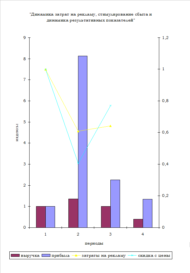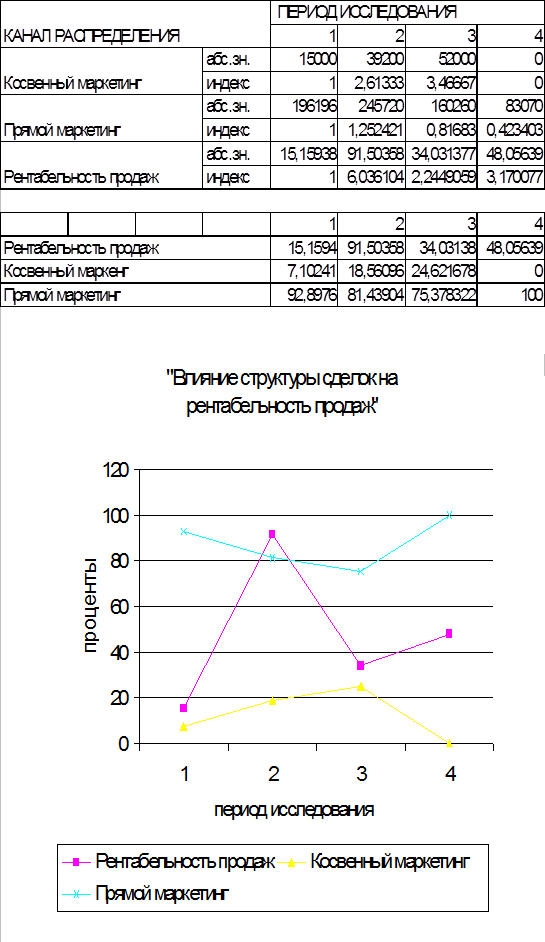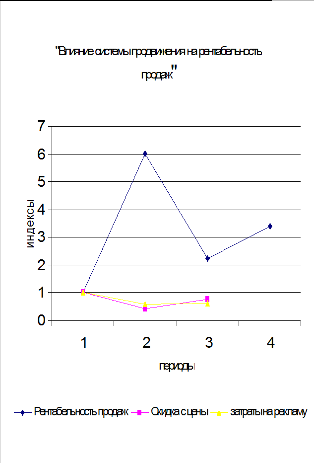Рис. 2 Для того чтобы выявить, какой кто канал распределения является, для фирмы наиболее предпочтительным, рассчитаем показатель структуры каналов распределения: Выр.ij Sij канал = -----------, j – вид канала Выр.i Динамика структуры распределения представлена в таблице №8 и график №6. График 6 ЗАО «Кормчий» является оптовой торговой компанией и имеет два канала распределения (косвенный и прямой). На основе графика №6 можно сделать вывод о том, что оба канала распределения по-разному влияют на рентабельность продаж. Во втором периоде была достигнута наибольшая рентабельность продаж, потому что ЗАО «Кормчий» использовал больше прямой канал распределения, чем косвенный. В следующем периоде ЗАО «Кормчий» решил меньше использовать прямой маркетинг, а попробовал использовать больше косвенный канал распределения. Вследствие этого, снизилась рентабельность продаж. И уже в четвертом периоде фирма решила больше не рисковать, а использовать прямой маркетинг, как основной канал распределения. Таким образом, наиболее предпочтительным для фирмы является прямой маркетинг, потому что он приносит наибольшую прибыль с наименьшими затратами. 2.7. «Анализ клиентурного рынка». 2.8. «Исследование эффективности системы продвижения продукции». Задача любой фирмы – сделать так, чтобы ее продукцию знали. Это и является целью продвижения товара на рынок. Продвижение – это всевозможные способы, используемые компанией для координации действий сотрудников, связи с клиентами и установление контактов с другими заинтересованными лицами. Существует немало возможностей продвижения товаров, а их сочетание составляет программа продвижения товаров. Программа продвижения – это способы, используемые компанией для общения с клиентами с целью завоевания их доверия. Существует четыре основных способа продвижения товара: 1. реклама 2. стимулирование сбыта 3. паблисити 4. персональная продажа ЗАО «Кормчий» использовало два способа продвижения товара: - рекламу - стимулирование сбыта Реклама – это форма неличного представления идей ч/з средства массовой информации. Реклама нашей фирмы нацелена как на крупных покупателей, так и на простого потребителя. Поэтому руководство ЗАО «Кормчий» выбрало несколько средств массового воздействия (в программе «Товар лицом» на ТРК Братск, полоса в газете «Ярмарка плюс», а также в «бегущей строке»). Стимулирование сбыта – это особый способ продвижения товаров, отличный от персональных продаж и реклама. Цель этого способа заключается в привлечении клиентов, и убедить их приобрести наш товар. Существует много форм стимулирования сбыта. ЗАО «Кормчий» использовало одну из таких форм – скидка с цены, т.е. постоянный клиент, приобретающий товар(или заключающий сделку) на большую сумму получает скидку в размере 5% от заключенной сделки. Структура продвижения товара размещена в таблице исходных данных №10 «Динамика затрат на рекламу и стимулирование сбыта».