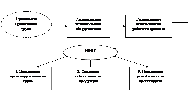 Рис. 1.1. Схема влияния организации труда на результаты деятельности предприятия. Уровень использования результатов научно-технического прогресса (изменения в технике, технологии производства) зависит от взаимосвязи и пропорциональности между совершенствованием техники и соответствующими изменениями в организации труда. Труд становится сложным и ответственным, а его несовершенная организация приводит к отрицательным последствиям. На уровне предприятия, организация труда - это система рационального взаимодействия работников со средствами производства и друг с другом, основанная на определённом порядке построения и осуществления трудового процесса, направленная на достижение конечных социально-экономических результатов. Являясь одной из функций управления производством, организация труда базируется на закономерностях и общих принципах управления, свойственных различным сферам хозяйственной деятельности. 1.2. Показатели экономической эффективности производства и их расчёт Важнейшими показателями экономической эффективности общественного производства служат трудоемкость, материалоемкость, капиталоемкость и фондоемкость. Еще одним показателем экономической эффективности производства является трудоемкость продукции - величина, обратная показателю производительности труда, определяется как отношение количества труда, затраченного в сфере материального производства, к общему объему произведенной продукции: t = T/Q, (1.2) T - количество труда, затраченного в сфере материального производства, чел.; Q - общий объем произведенной продукции (как правило валовой продукции), тыс. руб. Материалоемкость общественного продукта исчисляется как отношение затрат сырья, материалов, топлива, энергии и других предметов труда к валовому общественному продукту. Материалоемкость продукции отрасли (объединения, предприятия) определяется как отношение материальных затрат к общему объему произведенной продукции: m = M/Q, (1.3) где m - уровень материалоемкости продукции; M - общий объем материальных затрат на производство продукции в стоимостном выражении (затраты на сырье, материалы, топливо и др.), тыс. руб.; Q - общий объем произведенной продукции (как правило валовой), тыс. руб. Снижение материалоемкости продукции эффективно для любого предприятия, а также и для народного хозяйства страны в целом. Если мыслить в глобальном масштабе, то нельзя не забывать, что ресурсы Земле далеко не безграничны и к концу ХХ века человечество подошло к проблеме истощения полезных запасов. В известной степени близки между собой показатели капиталоемкости и фондоемкости продукции. Показатель капиталоемкости продукции показывает отношение величины капитальных вложений к определяемому ими приросту объема выпускаемой продукции: KQ = K / DQ, (1.4) где KQ - капиталоемкость продукции; K - общий объем капитальных вложений, тыс. руб.; DQ - прирост объема выпускаемой продукции, тыс. руб. Фондоемкость продукции исчисляется как отношение средней стоимости основных производственных фондов народного хозяйства к общему объему произведенной продукции: f = F/Q, (1.5) где f - фондоемкость продукции; F - средняя стоимость основных производственных фондов народного хозяйства, тыс. руб.; Q - общий объем произведенной продукции (как правило, валовой продукции), тыс. руб. В народном хозяйс