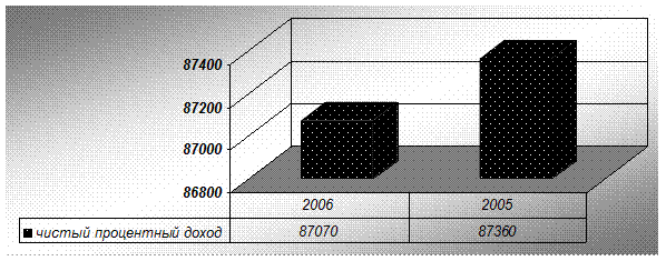 Рисунок 2.4. – Динамика процентных расходов, тыс.руб. Чистый процентный доход составил в 2006 году 87070 тыс.руб., однако в 2005 году он приравнивался 87360 тыс.руб., следовательно, общий чистый процентный доход сократился за счет увеличения процентных расходов по всем статьям и снижения доходов на 290 тыс.руб., или на 0,4 % (рис. 2.5.).