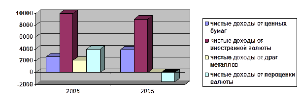 Из таблицы 2.7., видно, что по общей сумме чистые доходы от операций с активами, увеличились на 7223 тыс.руб., наибольшую степень увеличения составили чистые доходы от переоценки иностранной валюты на 5518 тыс.руб. и на конец периода составили 3941 тыс.руб., так как в 2005 году ОАО «ВТБ Северо-Запад» понес убытки от данной операции в размере 1577 тыс.руб. Чистые доходы от операций с ценными бумагами снизились на 1290 тыс.руб., по сравнению с 2005 годом, и составили 2612 тыс.руб. на 2006 год, это связано с тем, что снизилось количество операций с ценными бумагами. Наибольшую часть всех чистых доходов от операций с активами, составляют чистые доходы от операций с иностранной валютой, которые увеличились на 928 тыс.руб., и составили на конец анализируемого периода 9944 тыс.руб. Для большей наглядности динамики представим эти данные в виде диаграммы 2.6.