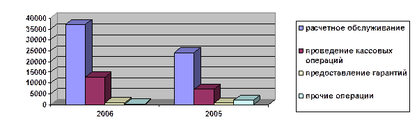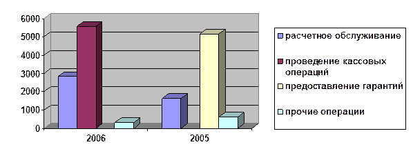 Наибольший вес по структуре занимает доходы от расчетного обслуживания, также здесь наблюдается тенденция увеличения, на 1,7%, и на конец анализируемого периода составили 72,8%. Доходы от проведения кассовых операций на 2005 год составили 20,8% и на 2006 год 24,9%, то есть увеличились доходы от данных операций на 4,1%. По доходам предоставление гарантий и прочих операций произошло снижение процентного дохода в 2006 году по сравнению с 2005 годом. Теперь представим динамику комиссионных доходов в виде диаграммы на рисунке 2.7.