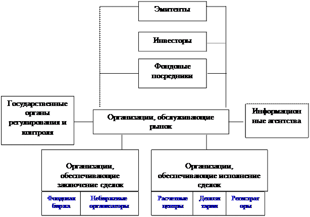 Рис.2 Участники рынка ценных бумаг. Фондовые посредники – это организации, осуществляющие на рынке ценных бумаг брокерскую или дилерскую деятельность по управлению ценными бумагами. Организации, обслуживающие функционирование рынка ценных бумаг, могут включать: - организаторов рынка ценных бумаг (фондовые биржи и др.); - расчетные центры (Расчетные палаты, Клиринговые центры); - депозитарии; - регистраторов; - информационные органы или организации. Государственные органы регулирования и контроля рынка ценных бумаг в Российской Федерации включают: - высшие органы управления (Президент, Правительство); - министерства и ведомства (Министерство финансов РФ, Федеральная Комиссия по рынку ценных бумаг и др.); - Центральный Банк РФ. 3.4. Классификация и виды ценных бумаг Существующие в современной мировой практике ценные бумаги делятся на два больших класса: Первый класс – основные ценные бумаги; Второй класс – производные ценные бумаги. Основные ценные бумаги – это ценные бумаги, в основе которых лежат имущественные права на какой-либо актив, обычно на товар, деньги, капитал, имущество, различного рода ресурсы и пр. Основные ценные бумаги, в свою очередь, можно разбить на две подгруппы: первичные и вторичные ценные бумаги. Первичные ценные бумаги основаны на активах, в число которых не входят сами ценные бумаги. Это, например, акции, облигации, векселя, закладные и пр. Вторичные ценные бумаги – это ценные бумаги, выпускаемые на основе первичных ценных бумаг; это ценные бумаги на сами ценные бумаги: варранты на ценные бумаги, депозитарные расписки и пр. Производная ценная бумага – это бездокументарная форма выражения имущественного права (обязательства), возникающего в связи с изменением цены лежащего в основе данной ценной бумаги биржевого актива. К производным ценным бумагам относятся: фьючерсные контракты (товарные, валютные, процентные, индексные и др.) и свободнообращающиеся опционы. Под видом ценных бумаг будем понимать такую их совокупность, для которой все признаки, присущие ценным бумагам, являются общими, одинаковыми. Различают классификации ценных бумаг. Классификации ценных бумаг – это деление ценных бумаг на виды по определенным признакам, которые им присущи. Классификации видов ценных бумаг – это группировки ценных бумаг одного и того же вида; это деление видов ценных бумаг на подвиды. В свою очередь, подвиды могут в ряде случаев делиться еще дальше. Каждая нижестоящая классификация входит в состав той или иной вышестоящей классификации. Например, акция – один из видов ценных бумаг. Но акция может быть обыкновенной и привилегированной. Обыкновенная акция может быть одноголосной или многоголосной, с номиналом или без номинала и т.п. Основными видами ценных бумаг с точки зрения их экономической сущности (они играют роль финансовых инвестиций) являются: акции, облигации, банковские сертификаты, фьючерсные контракты, срочные ценные бумаги, бессрочные ценные бумаги, инвестиционные, неинвестиционные. Теперь рассмотрим более подробно каждую из ценных бумаг. Акции удостоверяют право акционера на долю в капитале акционерного общества и на получение дохода (дивиденда) как результатов деятельности этого общества. Это единичный вклад в уставный капитал акционерного общества с вытекающими из этого правами. Сумма акции ес