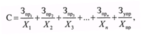Зупр — управленческие и коммерческие расходы отчетного периода, руб.; X1 , X2 , . . ., Хп — количество полуфабрикатов, изготовленных в отчетном периоде каждым переделом, шт.; Хпр — количество проданных единиц продукции в отчетном периоде, шт. Для повышения аналитичности расчетов затраты сырья и материалов в расчете на единицу продукции целесообразно учитывать отдельно, а в рамках переделов — лишь добавленные затраты (заработную плату плюс общепроизводственные расходы) каждого из них. Такая разновидность простого калькулирования называется калькулированием по стадиямобработки. Вышеприведенная формула в этом случае примет следующий вид: