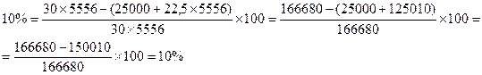 Филиал 2: 10% = ((7,5n – 25000) : 30n) × 100 10 = ((750n – 2500000) : 30n) × 100 300n = 750n – 2500000 300n – 750n = – 2500000 – 450n = – 12500000 n = 2500000 : 450 n = 5556 шт. Подставив полученное значение nв исходную формулу, получим: