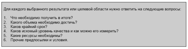 По результатам оценки и дискуссии об определении целей руководитель и его собственный начальник составляют план развития, который призван обеспечить наилучшую готовность руководителя к достижению результатов, запланированных на следующий период, и на более длительный срок – в целом. 1.2 Цели, ориентированные на результат. Как определить цели, ориентированные на результат. Для определения того, насколько оправдались ожидания по истечении определенного периода, используются цели, ориентированные на результат. Это требует от руководителя и вышестоящих менеджеров общего понимания уровня притязаний и условий для выполнения рассматриваемых задач. После того как цели обозначены, необходимо определить следующее: • что нужно получить в результате? (описание целей); • каковы необходимые условия? • как можно измерить или иначе определить степень достижения цели? Некоторые результаты могут быть измерены непосредственно, например количество привлеченных клиентов, количество продаж на одного сотрудника, среднее время обработки дел определенного вида. В других сферах может не быть методов прямого измерения. В таких случаях участвующие стороны должны совместно разработать методики, по которым они смогут в будущем устанавливать соответствующие цели и оценивать степень, до которой эти цели реализованы. В сфере межличностного общения или в областях более качественного характера невозможно или нецелесообразно устанавливать измеримые цели. В таких областях степень выполнения задач следует выражать словами. Самое важное, тем не менее, чтобы обе стороны имели единое понимание термина "ориентир на цели", которое на более поздней стадии и даст им основу для оценки степени реализации этих целей. Очень трудно, но при этом необходимо поставить максимально конкретные требования к результатам или целям. В большинстве организаций этого можно достичь через процесс обучения, в ходе которого стороны приобретают практический опыт и постепенно все лучше овладевают разработкой методик измерения и формулирования целей. Оценка, ориентированная на результат, приносит наибольшую пользу в том случае, если число целей ограничено. Лучше иметь несколько действительно важных и достаточно сложных целей, чем множество мелких и незначительных. Цели должны быть достаточно сложными, но реалистичными. Направление: результаты подразделенияРезультаты подразделения (бюро, департамента, группы, отдела) подразумевают результат деятельности отдела. Различные организации используют различную терминологию для названия (обозначения) результатов, например: услуги, продукт, рассмотренные дела, решения и пр. Ресурсы Þ процесс Þ продукт и пр. Следует выбрать от двух до пяти приоритетных областей или задач, которые будут наиболее важными для рассматриваемого подразделения и могут быть использованы в качестве основы для оценки руководителя. Это возможно только в том случае, если руководитель – как правило, через своих подчиненных – имеет значительное влияние на выработку результатов. Определяя требования в виде конкретных результатов, необходимо взвешивать эти требования с одной стороны, с точки зрения "текущих дел", а с другой стороны – "развития". Каждая организация должна определить для себя свои цели в виде результатов и методов их измерения. При опис