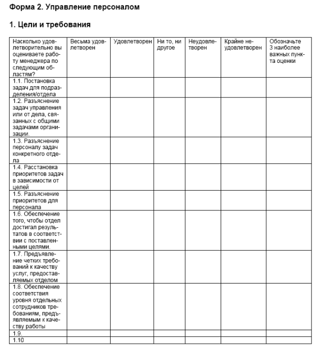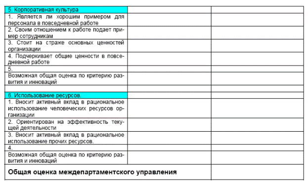 Краткая характеристика параметров.Результаты работы отдела – основа оценки. Неважно, насколько хорош руководитель в целом, единственное, что имеет значение – это приносит ли работа руководителя конкретные результаты, сравнимые с ожиданиями и требованиями, предъявляемыми к рассматриваемому подразделению. Эффективное управление персоналом – средство достижения целей, стоящих перед подразделением. Руководитель может достичь запланированных результатов только через своих починенных. Поэтому оценка того, как руководитель справляется со своими обязанностями по управлению людьми – один из основных элементов оценки руководителей, ориентированной на результат. Междепартаментское управление должно обеспечивать координацию и согласованность внутри организации таким образом, чтобы не возникало никаких "феодальных княжеств", самодостаточных в отрицательном смысле этого слова. Такие "феодальные княжества" могут добиваться определенных результатов, но не всегда они вносят вклад в достижение общих целей организации. Руководитель и его непосредственный начальник совместно определяют ряд показателей на следующий период по каждому из трех направлений. В конце отчетного периода обе стороны проводят совместную оценку степени достижения результатов. Стороны также обсуждают условия, в которых решались поставленные задачи, включая возможные препятствия. После этого стороны вновь совместно определят цели на следующий период, взяв за отправную точку общие цели организации и опыт прошедшего периода. В то же время менеджер и его непосредственный руководитель составляют план развития, реализация которого должна обеспечить менеджеру наилучшую готовность к достижению целей следующего отчетного периода и долгосрочных результатов в целом. Все 3 направления отражают целостность управленческих задач отдельного руководителя. Оценка результатов работы подразделения проводится руководителем и его непосредственным начальником. Когда рассматривается аспект управления персоналом, к участию привлекаются и подчиненные – путем использования анкет. При оценке междепартаментского управления параллельно проходят два процесса: во-первых, диалог между менеджером и его руководителем, и, во-вторых, обсуждение в группе руководителей общих вопросов междепартаментского управления.