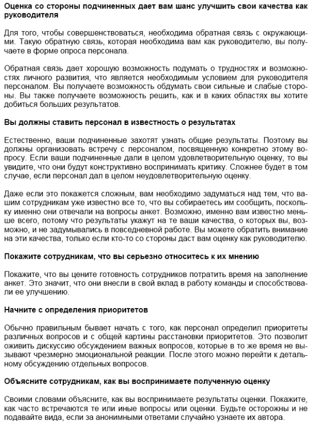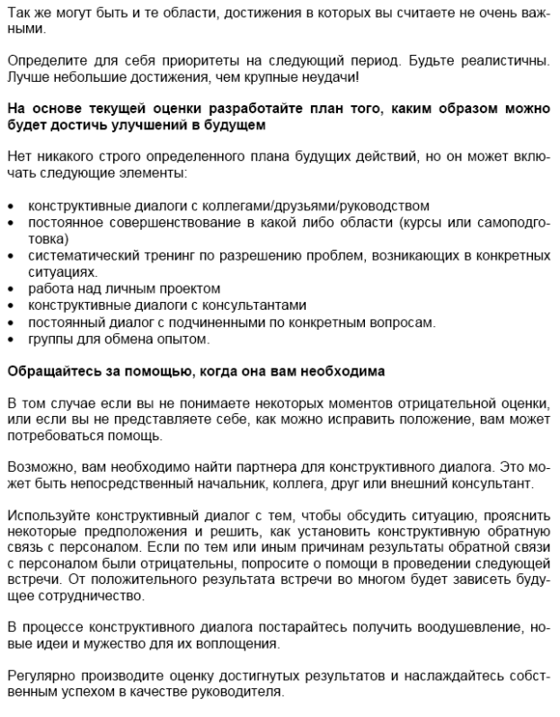 3. Развитие руководителя. Зачастую ощутимую пользу приносит планирование процесса, обеспечивающего работу руководителей с ориентиром на поставленные цели и выбор ключевых направлений междепартаментского управления. В такую программу развития могут также быть включены области управления персоналом, если существует потребность в общих усилиях по развитию/обучению. Например, может потребоваться повышение квалификации руководства в области: · формулирования общих целей и стратегий; · информирования о целях и стратегиях и их постоянное обсуждение; · обеспечения качества; · развития и поддержания имиджа организации; · предоставления услуг клиентам и заинтересованным группам; · сотрудничества внутри руководящей группы; · развития и инноваций; · более рационального использования ресурсов; · развития корпоративной культуры; · соблюдения сроков работ; · повышения эффективности; · управления; · расстановки приоритетов; · делегирования полномочий; · принятия решений; · развития персонала; · информации и коммуникации. Развитие руководителей может быть плодотворным, если оно организовано в виде взаимодействия общих или совместных мероприятий, событий и процессов для каждого руководителя. В программу развития руководителей могут включаться различные формы, например: · дискуссии в группе руководителей; · семинары; · мероприятия по формированию команды; · курсы; · отдельные проекты; · исследовательские кружки; · группы по регулярному обмену опытом в смежных областях; · спарринг-дискуссии; · наставничество; · ознакомительные поездки; · работа вне организации (в других организациях/странах); · обмен рабочими местами; · самостоятельные исследования. 4. Оценка персонала в применении совместно с другими инструментами менеджмента. Управление по целям Оценка руководителей, ориентированная на результат, является хорошим инструментом управления по целям. Общие цели организации разбиваются на цели департаментов, управлений и отделов. Наиболее важные цели, являющиеся результатом вдумчивой расстановки приоритетов, формируют основу для ориентированной на результат оценки менеджеров. Когда общие цели разбиваются подобным образом, создается ясность и прозрачность относительно приоритетных направлений организации. Цели «проходят красной нитью через всю организацию», и на отдельных менеджеров ложится ответственность за их достижение. Часто будет более целесообразно еще более детальное дробление целей и их привязка к группам или даже отдельным работникам. Таким образом, вся организация оказывается вовлеченной в процесс достижения целей и вносит вклад в получение результатов. В том случае, если ориентированная на результат оценка используется совместно с более традиционной формой управления по целям, к процессу добавляются два значимых показателя: управление персоналом и междепартаментское управление. Прочие инструменты менеджмента Некоторые организации через регулярные интервалы производят оценку рабочего «климата». Достоинством таких оценок «климата» является возможность обозначить конкретные проблемы по направлениям/подразделениям/отделам. Но часто эти проблемы носят общий характер и охватывают сразу несколько аспектов, относящихся как к психологическим, так и к физическим условиям труда. Оценка «климата» обыч