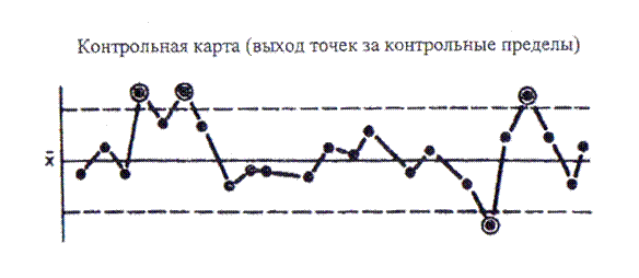 Рис.4 4) Приближение к контрольным пределам . Рассматриваются точки, которые приближаются к 3-сигмовым контрольным пределам, причем если 2 или 3 точки оказываются за 2-сигмовыми линиями, то такой случай надо рассматривать как ненормальный (рис.5).