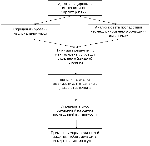 Группа B физической защиты. Меры следует устанавливать для того, чтобы удерживать от несанкционированного доступа и своевременным образом обнаруживать несанкционированный доступ и обладание источником. Группа C физической защиты. Меры следует устанавливать для того, чтобы удерживать от несанкционированного доступа и контролировать наличие источника в установленные интервалы времени. Группа в физической защиты. Меры следует устанавливать для того, чтобы обеспечить безопасное применение источника и его адекватную защиту как имущества, контролируя его наличие в установленные интервалы времени. Выбор качества и эффективности мер, которые воздействуют на вышеперечисленные требования, будет относиться к отдельному плану основных угроз. Блок-схема процесса оценки плана основных угроз представлена на рис.2. Защита от несанкционированного доступа к самой физической защите главным образом нацелена на то, чтобы пытаться предотвратить кражу материала. Меры по достижению тех же самых целей могут уже иметь место для системы безопасности с целью защиты от непредусмотренного радиационного облучения. Назначение в [2] групп физической защиты для радиоактивных источников наиболее эффективно достигается с использованием результатов оценки угроз. Это дает максимальную гибкость и специфичность для учета многообразия уровней угроз и защиты окружающей среды. Этот факт также допускает различные варианты выбора групп по обеспечению сохранности для радиоактивных источников на различных стадиях их жизненного цикла. И наоборот, некоторые страны могут делать оценки угроз и уязвимости для всей страны и осуществлять отнесение источников к группам по обеспечению сохранности, базирующееся на этих оценках.