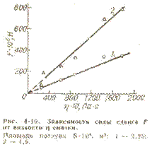 Соприкосновение двух трущихся поверхностей, покрытых слоями ПАВ, происходит по парафиновым цепочкам молекул ПАВ. Межмолекулярное взаимодействие между парафиновыми углеводородами осуществляется лишь дисперсионными силами. При сдвиге двух таких поверхностей следует разорвать межмолекулярные связи между двумя слоями парафиновых углеводородов, но не между твердой поверхностью и полярной группой молекулы ПАВ. Этот процесс подобен вязкому течению низкомолекулярных жидкостей и при увеличении давления сила сдвига должна изменяться настолько, насколько при этом изменяются межмолекулярные силы. Рис. 1. Зависимость силы сдвига F от нагрузки Р при использовании смазки вазелин — вазелиновое масло. Площадь трущейся поверхности S*104 , м2 : 1, 3, 5 — 4,9; 2, 4, 6 — 2,25. Соотношение вазелин—вазелиновое масло (по массе): 1, 2 — 3:1; 3, 4 — 1:1; 5,6 — 1:3. Рис. 2. Зависимость силы сдвига F от нагрузки Р для случаев несмазанной поверхности (1) и поверхностей, покрытых жидкой парафиновой смазкой (5) и слоями Лэнгмюра — Блоджет). В общем виде зависимость F от Р выражается кривыми, показанными на рис.1. Начальный участок этой зависимости параллелен оси абсцисс и определяется вязким течением, т. е. межмолекулярными силами. На рис. 2 приведены зависимости F от Р для несмазанной поверхности и поверхностей, покрытых смазкой. В случае поверхности, покрытой монослоями ПАВ, участок, параллельный оси абсцисс, мал и не обнаруживается. Второй типичной зависимостью для процесса трения является зависимость μ от Р (рис. 3). Участок этой зависимости при больших Р описывается законом Амонтона, а при малых нагрузках появляется зависимость от межмолекулярных сил. Действительно, из рис. 1 и 2 видно, что н начальном участке F не зависит от Р, но зато наблюдается явная зависимость от вязкости смазки и площади ползуна. Зависимость F от вязкостиприведена на рис. 4. При отнесении F к площади ползуна 5 обе зависимости описываются одной линией. Следовательно, на этом участке F =f(η) описывается уравнением Ньютона для вязкого трения: F = η Sg, где g — dυ/ dδ — градиент скорости. Таким образом, формула Амонтона—Кулона в случае жидких смазок складывается из законов Амонтона и Ньютона: