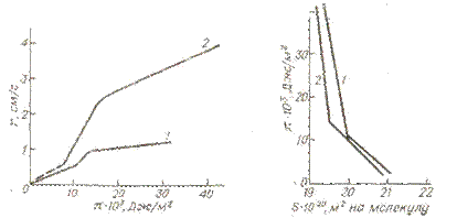 Рис. 5. Зависимость скорости испарения воды от поверхностного давления монослоя гексадецилового (1) и октадецилового (2) спиртов. Рис. 6. Изотермы поверхностного давления гексадецилового (1) и октадецилового (2) спиртов. Ла-Мер с сотрудниками исследовал зависимость скорости испарения с поверхности воды, покрытой монослоями ПАВ, от давления π. Характеристикой процесса служило сопротивление массопереносу, рассчитанное по обычной формуле: