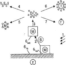 Стадии моющего действия при удалении жировых загрязнений показаны на рис.7. Рис. 7. Стадии моющего действия: 1 — смачивание водным раствором коллоидных ПАВ(В) масляных загрязнений (М)и твердой поверхности (Т);2 — преодоление адгезии и удаление масляных загрязнений с твердой поверхности; 3 — диспергирование ипептизация;4 — солюбилизация;5, 6 и 7 — удержание загрязнений в объеме в виде эмульсии, суспензии и на пузырьке пены соответственно. Первая стадия-это смачивание твердой поверхности, когда происходит замена гранцы раздела загрязнение-воздух и твердая поверхность-воздух на границу раздела масло-вода(М-В) и твердая поверхность-вода(Т-В). Улучшение смачивания происходит в результате снижения поверхностного натяжения на границе раздела фаз. На второй стадии моющего действия происходит отрыв частиц загрязнений. Для характеристики условий отрыва жировых загрязнений обозначим σ12 =σТМ , σ13 =σМВ , σ23 =σТВ (где М-масляные загрязнения, В-вода, Т-твердая поверхность). Изменение поверхностного натяжения эквивалентно изменению энергии Гиббса (ΔGВ ) в расчете на единицу площади раздела фаз. Оно определяет возможность преодоления адгезии масляных загрязнений в направлении, обратном формированию адгезионного взаимодействия. Значение Δ GB можно выразить как разность между начальным (до удаления загрязнения) поверхностным натяжением σтм и его конечным значением (после удаления этих загрязнений), а именно σТМ + σМВ , ΔG=σТМ -(σМВ +σТВ ) Для самопроизвольного процесса ΔGВ < 0 можно написать: σТМ -(σМВ +σТВ )<0 или σТМ <σМВ +σТВ Для самопроизвольного удаления загрязнений необходимо, чтобы межфазовое поверхностное натяжение σТМ было меньше поверхностного натяжения масла σМВ и твердого тела σТВ на границе с водой. Этот процесс осуществляется в результате адсорбции коллоидных ПАВ. Таким образом, первая и вторая стадии моющего действия связаны с поверхностными свойствами коллоидных ПАВ. За счет механического воздействия, например при стирке, можно усилить моющее действие, особенно в тех случаях, когда не происходит самопроизвольного нарушения адгезионного взаимодействия. В этом случае под действием ПАВ адгезия частиц загрязнений снижается, что способствует удалению их механическим путем. Отличительные особенности коллоидных ПАВ наиболее ощутимы на стадии моющего действия, которая заключается в удержании загрязнений в жидкой среде и в предотвращении их возможного оседания на обрабатываемую поверхность. Удержание частиц в растворе определяется целым комплексом коллоидных свойств растворов ПАВ (3—7 на рис. 7). Прежде всего происходит диспергирование частиц на более мелкие (3; этот процесс схематически показан в отношении большой частицы). Комки твердых загрязнений в результате пептизации переходят во взвешенное состояние с одновременным дроблением крупных частиц на более мелкие или разрушением агрегатов. Затем на поверхности частиц образуются адсорбционно-сольватные слои, которые препятствуют агрегации частиц и удерживают их во взвешенном состоянии, т.е. происходит образование стабилизированной суспензии. Пептизация с одновременным суспендирущим действием коллоидных ПАВ способствует удержанию твердых загрязнений. В случае жидких жировых загрязнений возможно самопроизвольное диспергирование до мелких капель, когда дисперсная систем