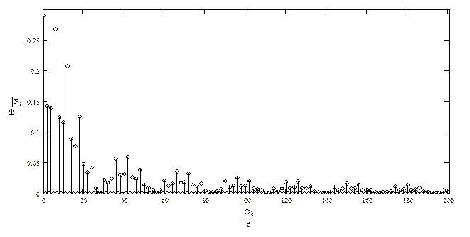 Рисунок 2.2.3 – Зависимость спектрального состава заданного ШИМ-сигнала при q=6. Таблица 2.2.1 – Данные для построения зависимости амплитуды напряжения пульсации на нагрузке от частоты ШИМ