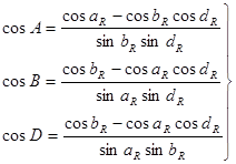 При этом сферический избыток при сторонах 90 км < S < 250 км, следует вычислять по формуле (25), а при сторонах S <90 км -по формуле (23). Рабочие формулы:
