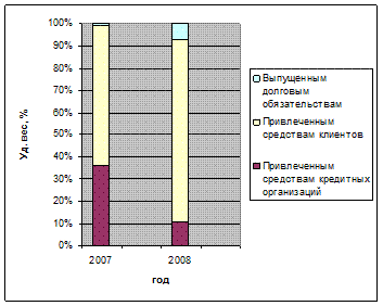 Рис.2. Динамика собственных средств и обязательств Банка ВТБ24(ЗАО) в 2007-2008 гг. В отношении обязательств таблицы 2 проявляется общая тенденция высокого удельного веса средств клиентов, поскольку данная статья определяет основной источник внешнего финансирования банка. Увеличение доли данной статьи произошло в 2007 г. (+8,53 п.п.), в абсолютном выражении средства клиентов выросли примерно в 2 раза, в 2007 г. прирост был чуть ниже и составил 166,76%. Данный факт можно расценить как положительный, поскольку банк стал менее зависим от ресурсов межбанковского рынка. Но важно указать на появление в 2008 году кредитов ЦБ РФ, что связано со спецификой кризисного ситуации этого года. Удельный вес прочих элементов привлеченных средств банка низок, и данные статьи остаются сравнительно стабильными на протяжении анализируемого периода. Как правило, при бесперебойном функционировании банка эти обязательства не подвергаются непредвиденным и резким колебаниям. Таблица 2 Динамика состава и структуры обязательств Банка ВТБ24 (ЗАО) в 2007-2008 гг.