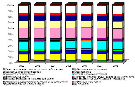 Рисунок 2 – Структура ВВП США в текущих ценах по отраслям, 2002-2008 гг., %. Источникданных: Bureau of Economic Analysis (BEA), U.S. Department of Commerce Нельзя не отметить, что в ВВП России и США, уменьшилась доля отраслей, связанных с производством товаров, и увеличилась доля отраслей, связанных с производством услуг (рис. 3 и 4).