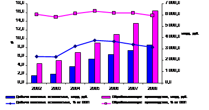 Рисунок 5 – Составляющие ВВП по отраслям экономики в 2008 году. Источник: оценки CIA – The World Factbook, 2009 Отметим, что в российском ВВП велика роль отрасли "Добыча полезных ископаемых". Но в начале века существенно выросла и добавленная стоимость в обрабатывающих производствах (см. рис. 6).