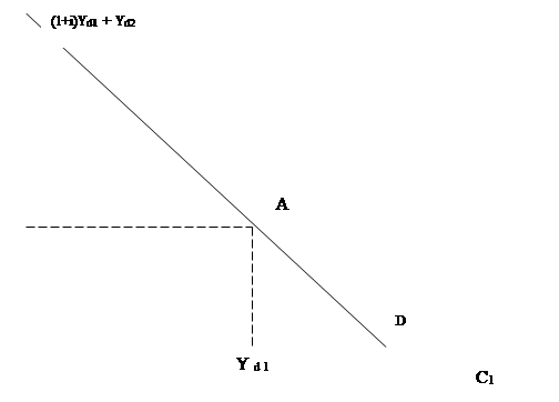 Ця модель пов’язана з виявленням правил поведінки домогосподарств як суб’єктів економіки з приводу прийняття рішень стосовно поточного та майбутнього споживання. Головним обмежувачем споживання є рівень доходу. Його називають бюджетним обмеженням. Приймаючи рішення стосовно того, від якої частки споживання у поточному доході слід відмовитись сьогодні, щоб максимізувати споживання у майбутньому, слід розглянути між часове бюджетне обмеження. Припустимо, що споживач, який здійснює між часовий вибір, живе в двох часових періодах: молодість та старість. Нехай в першому періоді споживач має дохід Yd 1 , а обсяг споживання – С1. У другому часовому періоді -Yd 2 та С2. При цьому зазначимо, що всі змінні вимірюються реальними величинами, тобто скореговані на рівень інфляції. Згадаймо, що споживач може брати в борг, а тому його поточне споживання може перевищувати поточний рівень доходу. І він може також заощаджувати. Тоді його поточне споживання буде менше за поточний дохід. Розглянемо насамперед вплив доходу в кожному із періодів на обмеження споживання. У першому періоді заощадження перевищують доходи, тобто S= Yd 1 – С1 (1) Частина неспожитого доходу поточного періоду (заощадження) приносить власнику додатковий дохід у вигляді процента (і) якщо, він зберігається на рахунку в банку. Тому в другому періоді споживання (С2 ) буде визначатись обсягом доходу другого періоду (Yd 2 ) плюс заощадження першого періоду (S) та плюс процент на ті заощадження (S*і) тобто С2 = Yd 2 +S + S*і = Yd 2 + S( 1 + і) (2) Ми розглянули ситуацію, коли споживач у першому періоді частину свого доходу нагромаджує, а у другому весь свій дохід споживає, оскільки третього періоду немає. Але у першому періоді можна не тільки нагромаджувати, а й жити в борг, тобто позичати. За цих умов рівняння (1) і (2) мають однаковий вигляд, але S будуть мати від’ємне значення, оскільки позичка означає від’ємні заощадження. Для спрощення припустимо, що процентна ставка з позик та процентна ставка з заощаджень однакові. Для виведення бюджетного обмеження споживача об’єднаємо рівняння (1) та (2), замінивши у рівнянні (2) S значенням із рівняння (1) С2 = Yd 2 + S( 1 + і) = (Yd 2 - С2 )( 1 + і) Здійснимо певні перетворення: А) Розкриємо у рівнянні справа дужки С2 = Yd 2 + Yd 1 (1+ і ) – С1 ( 1+ і) Б) перенесемо вираз – С1 ( 1+ і)ліворуч С2 + С1 ( 1+ і) = Yd 2 + Yd 1 (1+ і ) В) розділимо обидві частини рівняння на (1+ і ) С1 + С2 / (1+ і ) = Yd 1 + Yd 2 /(1+ і ) Останнє рівняння – вираження між часового бюджетного обмеження споживача Зміст його полягає в тому, що споживання за два часових періоди дорівнює сумарному доходу за ці періоди. Якщо процентна ставка більша за нуль, то майбутні споживання і дохід дисконтуються на ( 1 + і). Множник 1 / (1+ і ) – це ціна споживання другого періоду, виражена в одиницях першого періоду. Іншими словами це споживання першого періоду, від якого споживач мусить відмовитись, заради збільшення одиниці споживання в другому періоді. Графічно бюджетне обмеження зображено на рисунку 1.