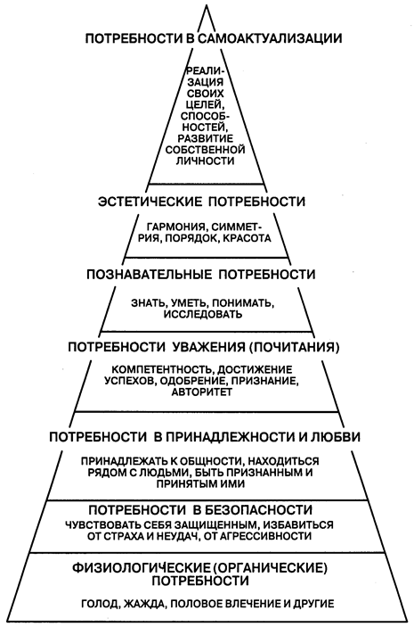 Структура потребностей по А. Маслоу Мотивация – это обусловленное актуализированной потребностью возбуждение определенных нервных структур (функциональных систем), вызывающих направленную активность организма. (Так, например, могут возникнуть пищевая, половая, познавательная, защитная и другие виды мотивации.) От мотивационного состояния зависит допуск в кору головного мозга тех или иных чувственных возбуждений, их усиление или ослабление. Эффективность внешнего стимула зависит не только от его объективных качеств, но и от мотивационного состояния организма. (Сытый организм не реагирует на самую привлекательную пищу.) Внешние раздражители становятся стимулами, т.е. сигналами к действию лишь при соответствующем мотивационном состоянии организма. Мозг при этом моделирует параметры объектов, которые необходимы для удовлетворения потребности, и схемы деятельности по овладению требуемым объектом. Эти схемы – программы поведения – могут быть или врожденными, инстинктивными, или основанными на индивидуальном опыте. Мотивация поведения всегда эмоционально насыщена. То, к чему мы стремимся, нас эмоционально волнует. При этом одни эмоции выполняют стратегическую функцию – являются индикатором потребностей, значимости определенного класса объектов, другие связаны с определением значимости отдельных условий, обеспечивающих достижение объекта потребности. Являясь непосредственным "определителем" значимости, полезности или вредности тех или иных явлений, эмоции обеспечивают соответствующую энергетическую мобилизацию организма на соответствующее взаимодействие индивида с этими объектами. Мотивационные состояния человека существенно отличаются от мотивационных состояний животных тем, что регулируются второй сигнальной, обобщенной системой ценностных ориентации личности. Все мотивационные состояния являются модификацией потребностных состояний. К мотивационным состояниям человека относятся интересы, желания, стремления, намерения, влечения, страсти, установки. Мотивация человека может быть сознательной и подсознательной. Сознательная мотивация связана с намерением. Намерение (в юридической терминологии – "умысел") – это сознательно принимаемое решение достичь определенной цели с отчетливым представлением средств и способов действия. В намерении объединяются побуждение к действию и его сознательное планирование. Намерения, как и потребности, обладают динамическими свойствами – силой, напряженностью и др. Намерения организуют поведение человека, обеспечивают произвольность его действий, выступают как сознательный акт поведения. Сознательным обоснованием намерения является мотив. Термин "мотив" в переводе с латинского означает побуждение, однако не всякое побуждение является мотивом; поведение может побуждаться чувствами, установками. Одни побуждения осознаются, другие не осознаются. Мотив – это осознанное побуждение к достижению конкретной цели, понимаемое индивидом как личностная необходимость. Если понятие мотивации включает в себя все виды побуждений человеческого поведения (в том числе и малоосознанные и подсознательные), то мотив – сознательно сформированные, понятийно оформленные побуждения. Деятельность человека обычно побуждается несколькими мотивами – иерархией мотивов При э