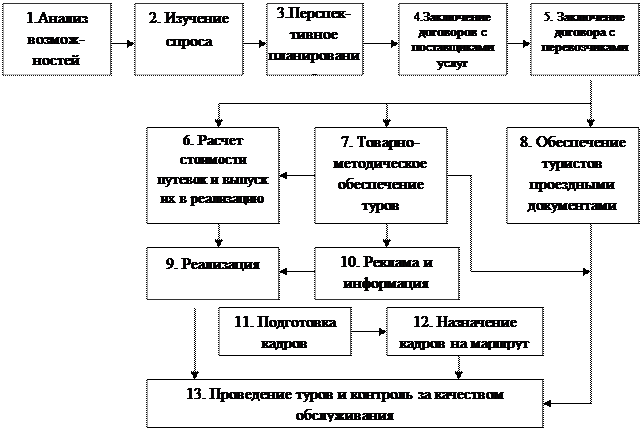 Иногда, как уже говорилось, туроператоры могут продавать услуги по отдельности. Это дополнительный вид деятельности или объективно необходимый шаг на рынке. Например, туроператоры продают места на авиарейсы (чартер или регулярный, забронированный рейс или как агенты), чтобы заполнить необходимое количество мест, выкупленных ими по квоте льготной цены. В этих случаях они выступают как оптовики или как посредники. Примером инициативных специализированных туроператоров являются транс туры на специализированном арендованном транспорте (круизные на теплоходах, автобусные маршрутные туры по нескольким городам или странам, железнодорожные туры и пр.). Туроператоры выполняют ведущую роль в туризме, так как именно они (в отличие от турагентов) занимаются формированием основных и дополнительных услуг в единый туристский продукт, который затем реализуют потребителю через агентскую сеть. Схема работы туроператора представлена на рисунке 1.2.